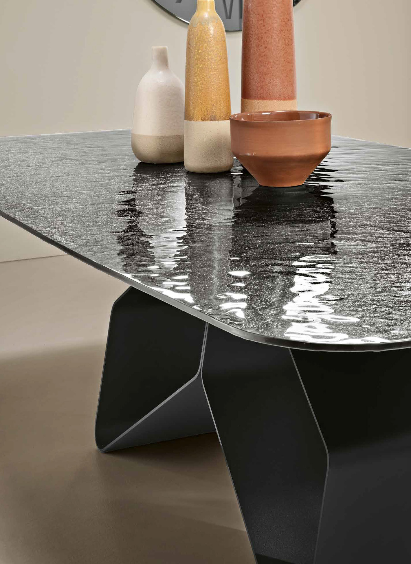 Tavolo che gioca con i contrasti tra leggerezza visiva e solidità strutturale. Il basamento in metallo verniciato (nero o bronzo) ha un disegno grafico che ricorda due ali di farfalla. Il piano rettangolare con angoli smussati è disponibile in vetro (per riflessi luminosi) o in ceramica effetto marmo stratificata su vetro (per un’estetica materica).