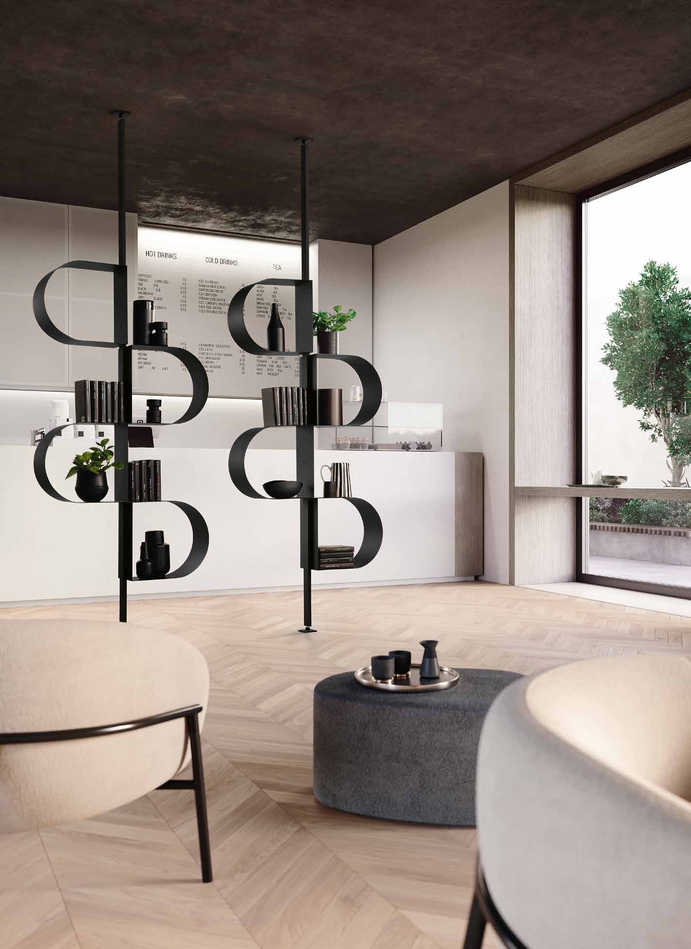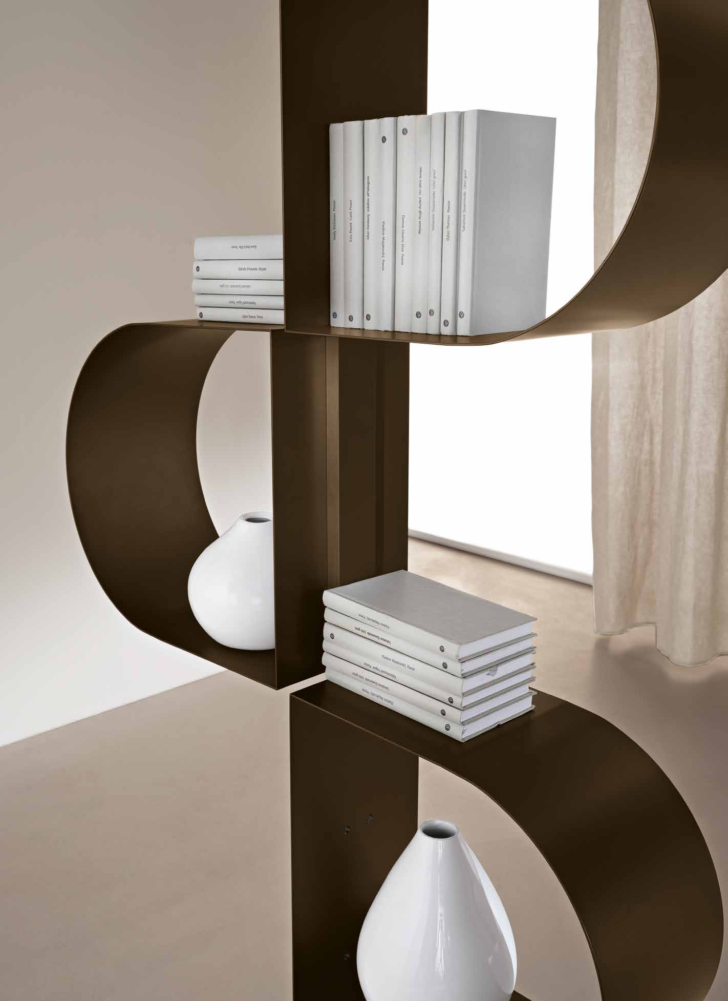 Tiffany è una libreria verticale, slanciata ed essenziale, in metallo verniciato. La sua struttura, come un nastro, crea una sequenza ritmica di conche per accogliere libri e oggetti. Disponibile con fissaggio a muro o a soffitto, la versione a soffitto può essere usata a centro stanza come divisorio. Finiture: perla beige, bronzo e nero.